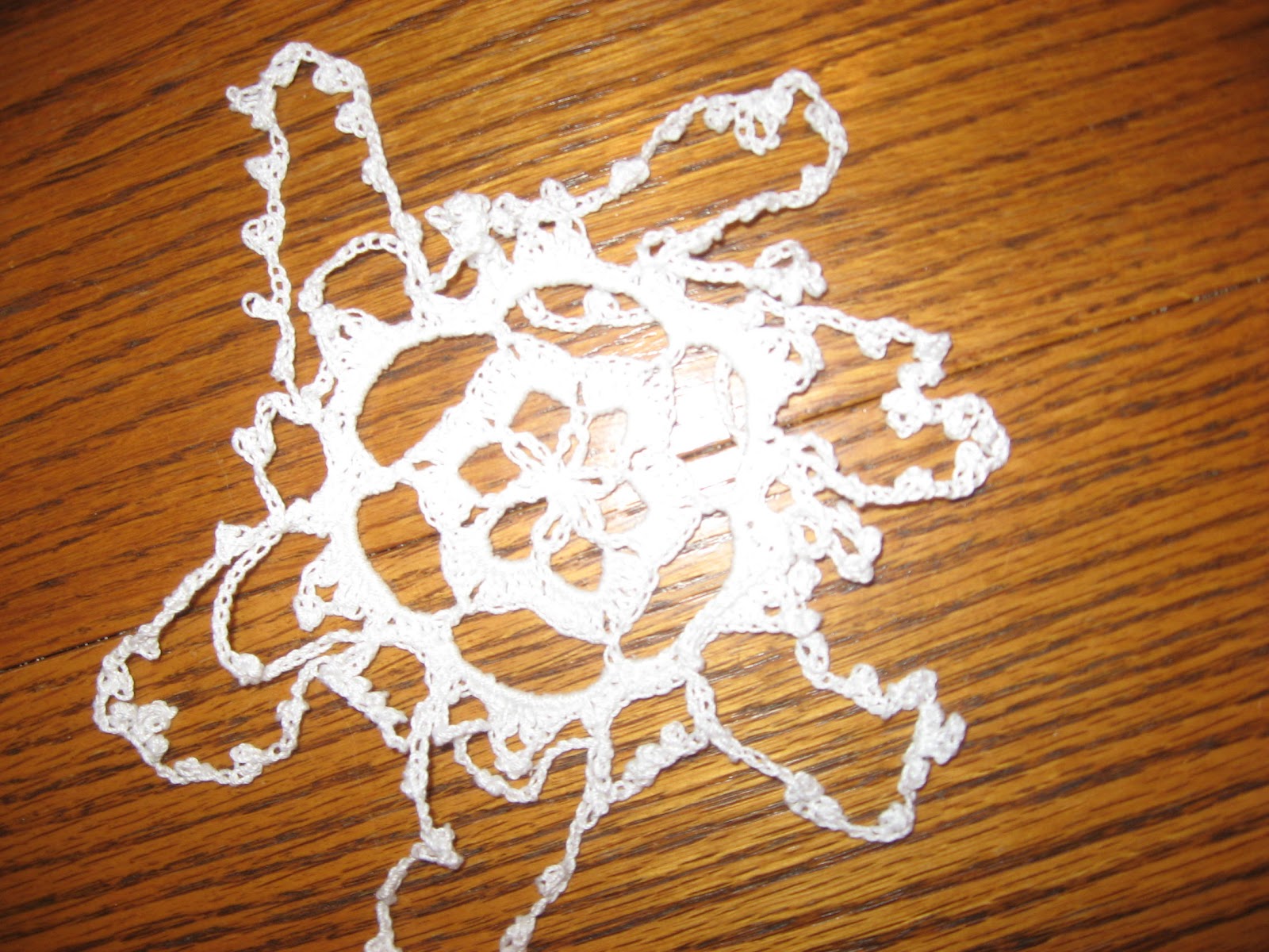 And then a snowflake I found and crocheted from a book named, 99 Snowflakes (1998 Leisure Arts) Believe me it will look a lot better after it is shaped and stiffened.